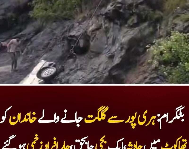 بٹگرام کی تحصیل تھاکوٹ کے علاقے میں ایک دل خراش حادثہ پیش آیا جہاں ہری پور سے گلگت جانے والا ایک خاندان حادثے کا شکار ہو گیا۔ ابتدائی اطلاعات کے مطابق تیز رفتاری یا سڑک کی خراب صورتحال کے باعث گاڑی بے قابو ہو کر قریبی ندی میں جا گری۔