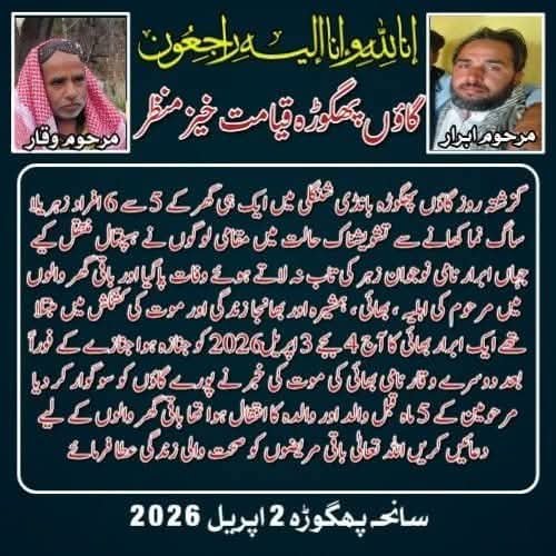اوگی کے نواحی گاؤں پھگوڑہ (یوسی بانڈی شنگلی) میں ایک نہایت افسوسناک واقعہ پیش آیا، جہاں زہریلا جنگلی ساگ کھانے کے باعث ایک ہی خاندان کے دو نوجوان بھائی جاں بحق ہوگئے، جبکہ تین خواتین سمیت چار افراد کی حالت تشویشناک بتائی جا رہی ہے۔