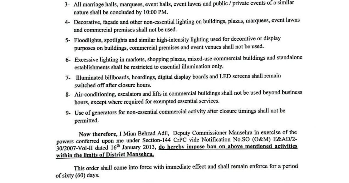 📢 ضلع مانسہرہ میں دفعہ 144 نافذ — کاروباری اوقات اور توانائی استعمال پر نئی پابندیاں جاری.