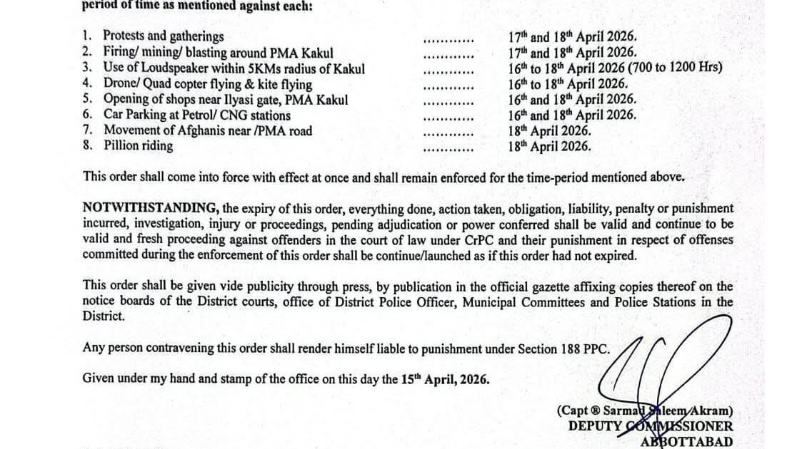 نوٹیفکیشن کے تحت 17 اور 18 اپریل کو احتجاج، جلسے جلوس اور ہر قسم کے عوامی اجتماعات پر مکمل پابندی ہوگی۔ اس کے علاوہ پی ایم اے کاکول کے اطراف فائرنگ، ڈرون کے استعمال اور کبوتر بازی پر بھی پابندی عائد کر دی گئی ہے۔