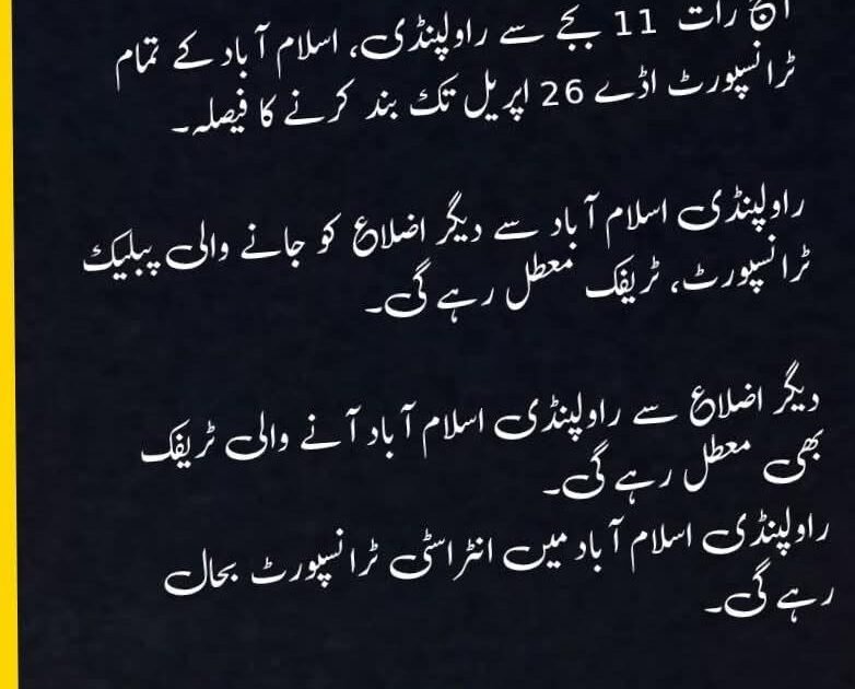 راولپنڈی اور اسلام آباد سے دیگر اضلاع جانے والی تمام پبلک ٹرانسپورٹ بند رہے گی۔