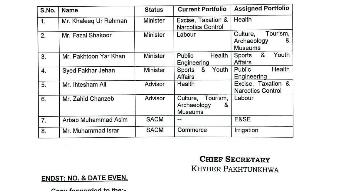 پشاور: وزیراعلیٰ خیبرپختونخوا علی امین خان گنڈاپور کی منظوری کے بعد صوبائی کابینہ میں وزراء، مشیروں اور معاونینِ خصوصی کے محکموں میں ردوبدل کر دیا گیا ہے۔ اس حوالے سے باقاعدہ نوٹیفکیشن چیف سیکرٹری خیبرپختونخوا نے جاری کر دیا۔
