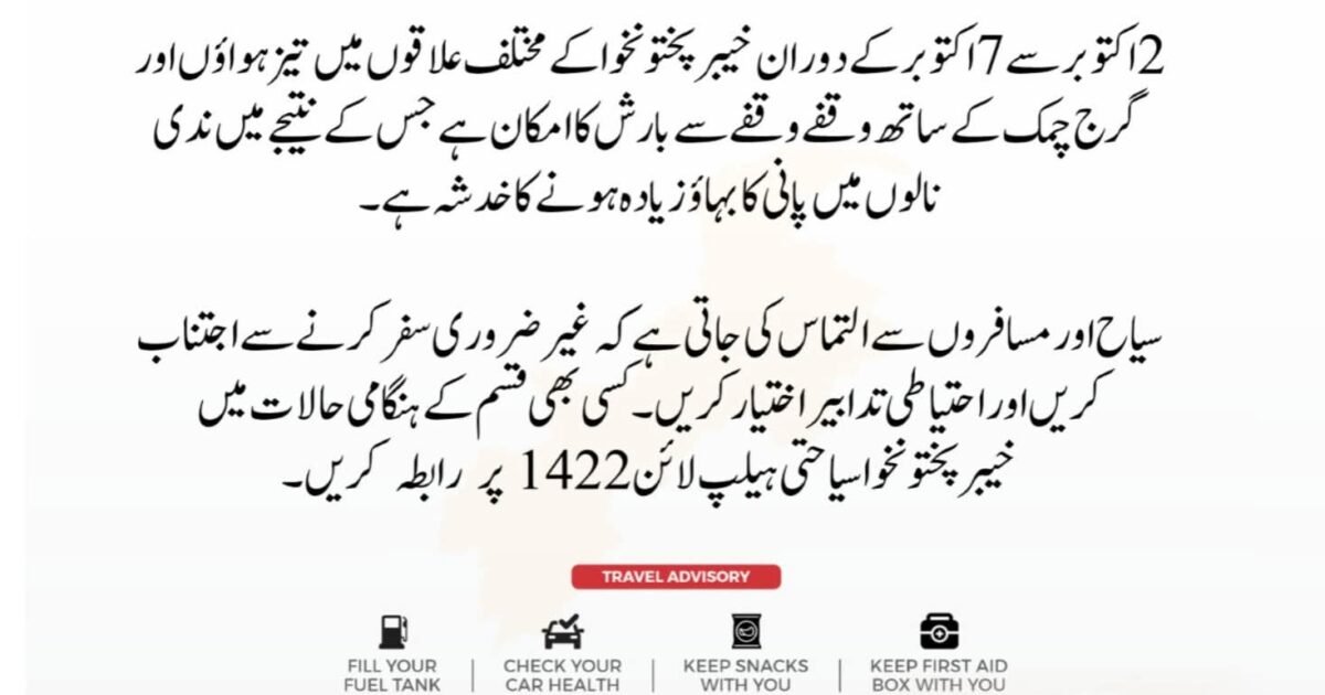 مزید برآں، ہنگامی صورتحال پیش آنے کی صورت میں شہریوں اور سیاحوں کو ہدایت کی گئی ہے کہ فوری طور پر خیبرپختونخوا سیاحتی ہیلپ لائن 1422 پر رابطہ کریں۔