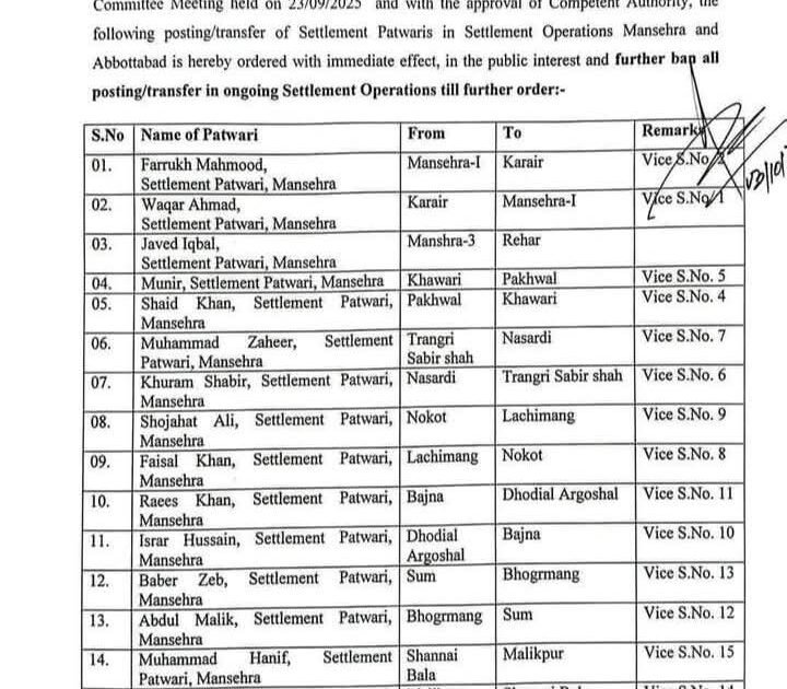 ضلع مانسہرہ میں محکمہ مال کے اندر بڑے پیمانے پر انتظامی تبدیلیاں عمل میں لائی گئی ہیں۔ متعدد حلقوں کے پٹواریوں اور گردآوروں کے تبادلے کر دیے گئے ہیں۔