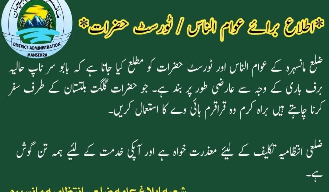 ضلعی انتظامیہ مانسہرہ نے عوام الناس اور سیاحوں کو خبردار کیا ہے کہ حالیہ برف باری کے باعث بابوسر ٹاپ ہر قسم کی ٹریفک کے لیے عارضی طور پر بند کر دیا گیا ہے۔