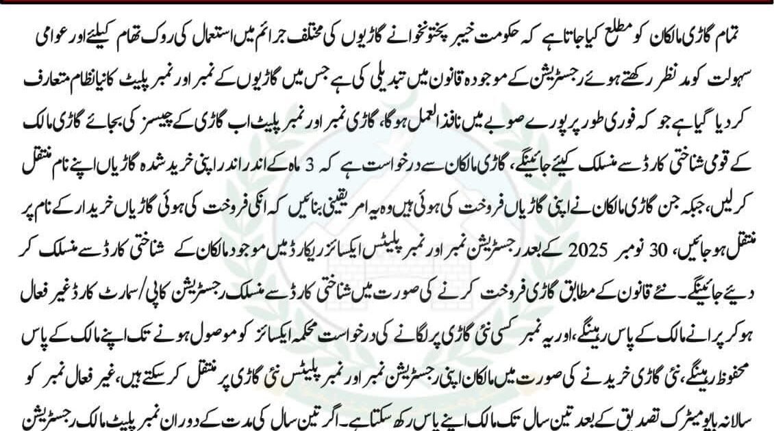 حکومتِ خیبر پختونخوا نے گاڑیوں کی غیر قانونی سرگرمیوں میں استعمال کی روک تھام اور عوامی سہولت کے پیشِ نظر گاڑیوں کی رجسٹریشن کے نظام میں اہم تبدیلیاں متعارف کرا دی ہیں۔ نئے قانون کے تحت اب گاڑی کا نمبر اور نمبر پلیٹ چیسز نمبر کے بجائے گاڑی مالک کے قومی شناختی کارڈ (CNIC) سے منسلک کیا جائے گا۔