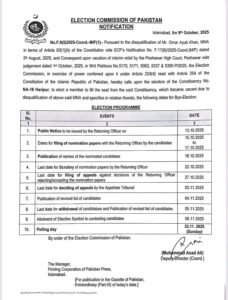 پبلک نوٹس ریٹرننگ آفسر کی جانب سے ۱3 اکتوبر 2025کو جاری کیا جائیگا اور کاغذات نامزدگی جمع کروانے کا سلسلہ 15سے 17 اکتوبر 2025 تک جاری رہے گا۔