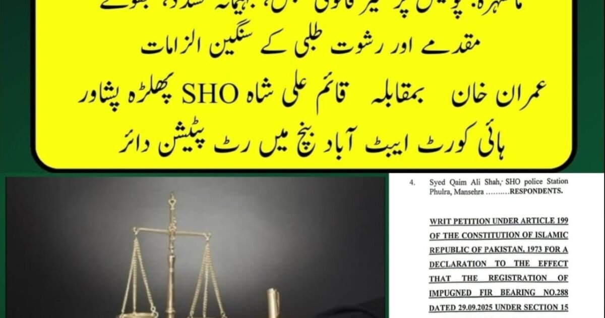 ضلع مانسہرہ کے علاقے درویش پڑھنہ کے رہائشی عمران خان ولد گل زمان خان نے تھانہ پھلڑہ پولیس کے خلاف غیرقانونی حبسِ بےجا، بہیمانہ تشدد، رشوت طلبی اور جھوٹا مقدمہ درج کرنے کے الزامات کے تحت پشاور ہائی کورٹ ایبٹ آباد بنچ میں رٹ پٹیشن دائر کر دی ہے۔