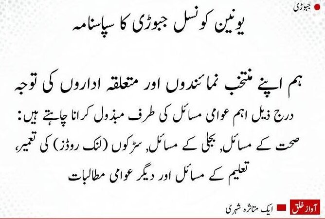 ہم اپنے منتخب نمائندوں اور متعلقہ اداروں کی توجہ درج ذیل اہم عوامی مسائل کی طرف مبذول کرانا چاہتے ہیں: