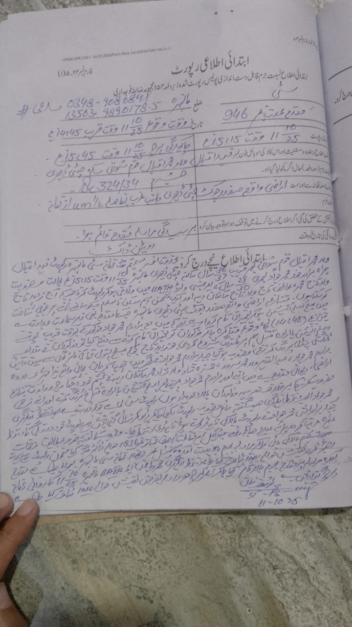 اور مذکورہ زمین تقسیم کا کیس مقامی عدالت میں زیر سماعت ہے. گزشتہ روز مبینہ قبضہ کی نیت سے زاہد تاج ولد تاج محمد اور عاطف تاج ولد تاج ساکنان چٹی ڈھیری مذکورہ متنازعہ اراضی پر زبردستی تعمیراتی کام کروا رہے تھے. جس پر میں اپنے بھائی محمد جواد کے ہمراہ موقع پہنچا اور متنازعہ اراضی جس کا کیس بھی مقامی عدالت میں زیر سماعت ہے اس پر تعمیرات کرنے سے منع کیا. جس پر با اثر و منہ زور قبضہ مافیا سرغنہ زاہد تاج نے آتشیں اسلحہ سے اندھا دھند فائرنگ کردی. جس سے میری دائیں ٹانگ میں گولی لگنے سے زخمی ہو گیا. جبکہ میرے بھائی محمد جواد نے قریبی گھر میں پناہ لے کر جان بچائی.