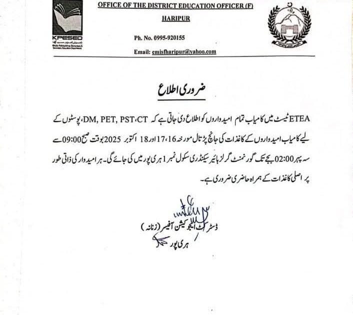 تمام متعلقہ اُمیدواران سے گزارش ہے کہ اپنے اصل دستاویزات کے ساتھ مقررہ تاریخ اور وقت پر سکروٹنی کے لیے مقررہ مقام پر حاضر ہوں۔