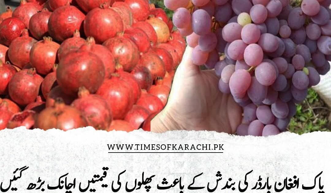 میڈیا رپورٹ کے مطابق طورخم بارڈر بند ہونے سے پشاور میں پھلوں کی قیمتوں میں ہوشربا اضافہ ہو گیا ہے۔انگور کی فی کلو قیمت 400 سے بڑھ کر 800 روپے تک پہنچ گئی ہے جبکہ انار فی کلو 300 سے بڑھ کر 600 روپے ہو گیا ہے۔اسی طرح سیب کی فی کلو گرام قیمت 200 سے بڑھ کر 400 روپے ہو گئی ہے۔