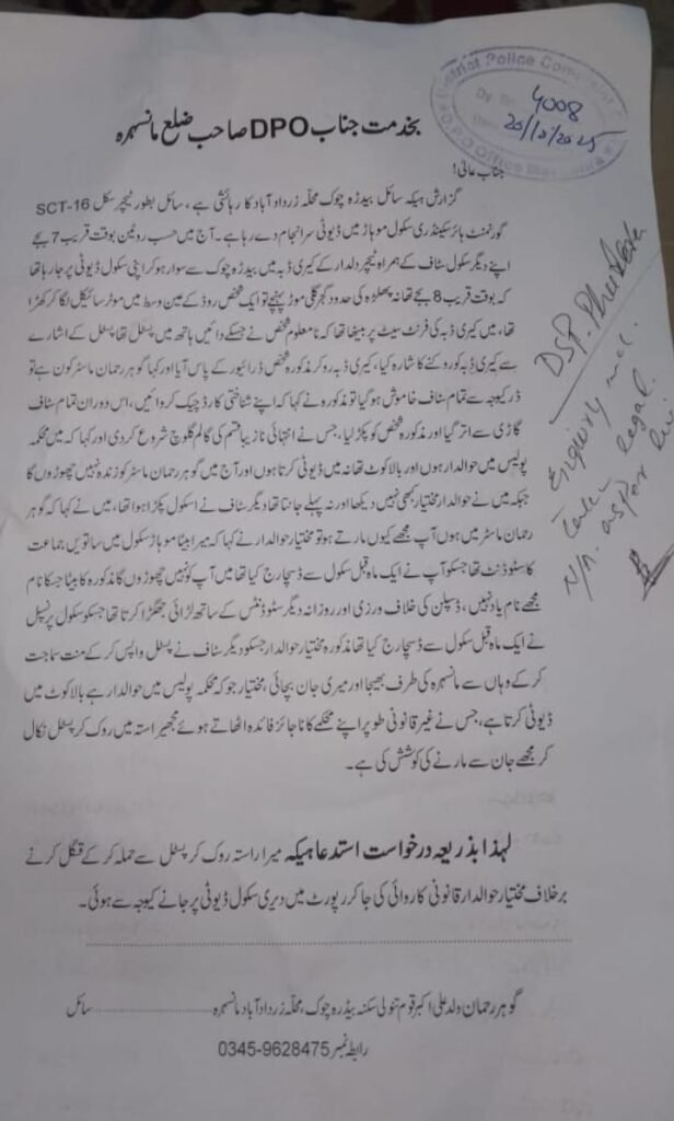 مانسہرہ: تھانہ پھلڑہ حدود پولیس اہلکار کی جان سے مارنے کی کوشش، سکول ٹیچر محفوظ رہے. تفصیلات کے مطابق تھانہ بالاکوٹ میں تعینات پولیس اہلکار حوالدار مختیار نے ذاتی رنجش پر گورنمنٹ ہائر سکینڈری سکول مو ہاڑ پھلڑہ کے نیچر سکل ٹیچر گوہر رحمان ولد علی اکبر کو جان سے مارنے کی کوشش کی، تاہم بروقت مداخلت سے ٹیچر محفوظ رہے۔