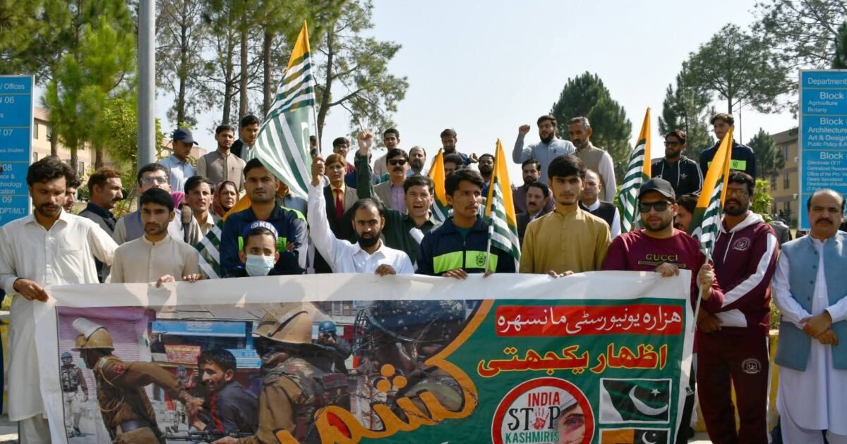 مانسہرہ : مقبوضہ کشمیر میں مبینہ بھارتی ظلم و بربریت کے خلاف گزشتہ روز ہزارہ یونیورسٹی میں 27اکتوبربطور یوم سیاہ منایا گیا۔