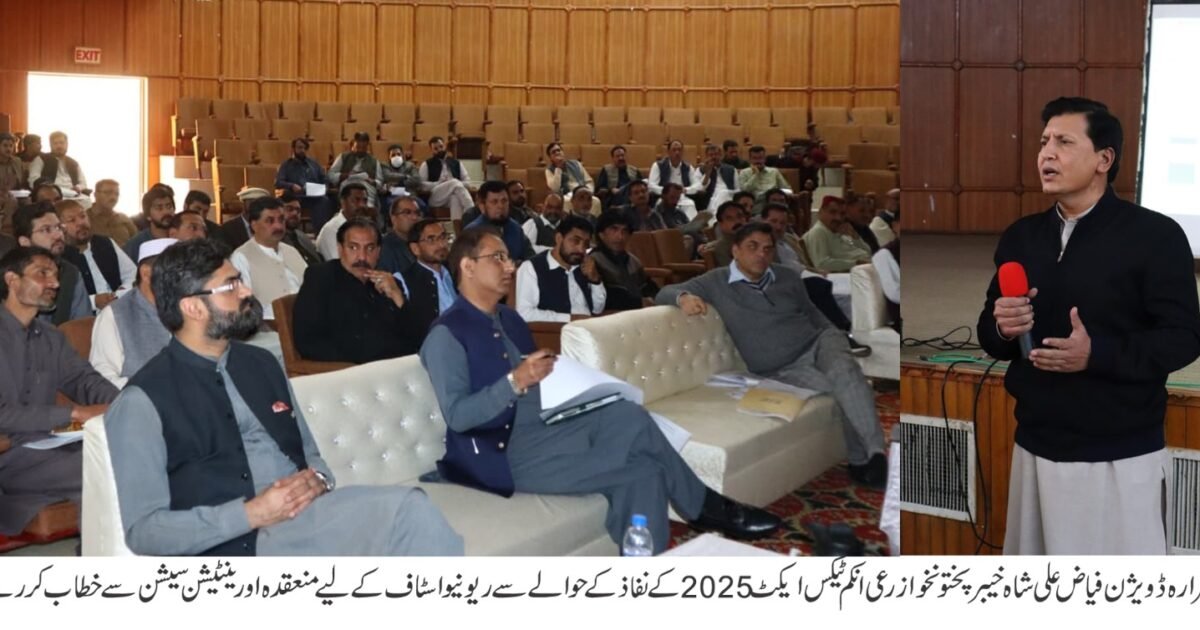 ایبٹ آباد: خیبر پختونخوا زرعی انکم ٹیکس ایکٹ 2025 پر عمل درآمد کے حوالے سے ریونیو سٹاف کے لیے ایک اورینٹیشن سیشن جلال بابا اڈیٹوریم ایبٹ آباد میں منعقد ہوا۔ کمشنر ہزارہ ڈویژن فیاض علی شاہ نے سیشن میں خصوصی شرکت کی۔