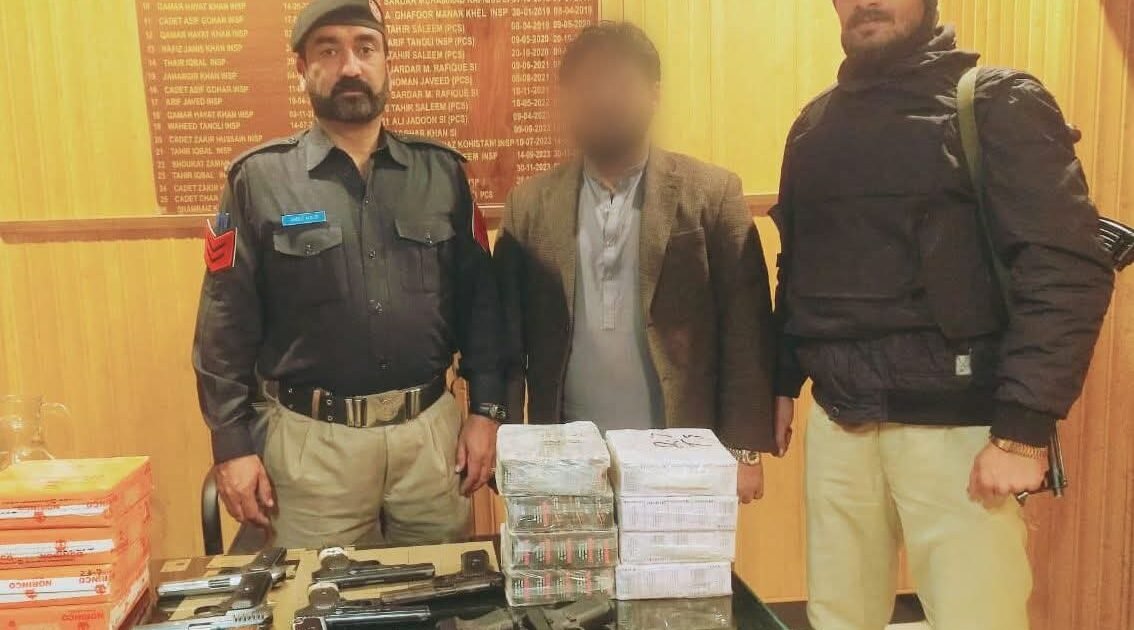 کارروائی کے دوران ملزم مدثر ولد یاسین سکنہ پشاور سے بھاری مقدار میں اسلحہ برآمد ہوا، جس میں 7 عدد پستول 30 بور، 2 عدد پستول 9 ایم ایم اور 6000 کارتوس شامل ہیں۔