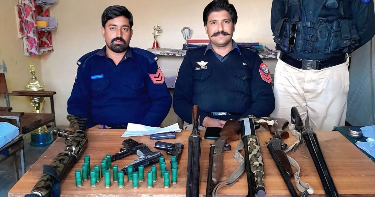 4 عدد بندوق 12 بور، 2 عدد رپیٹر 12 بور، 3 عدد پستول 30 بور اور 26 عدد کارتوس۔