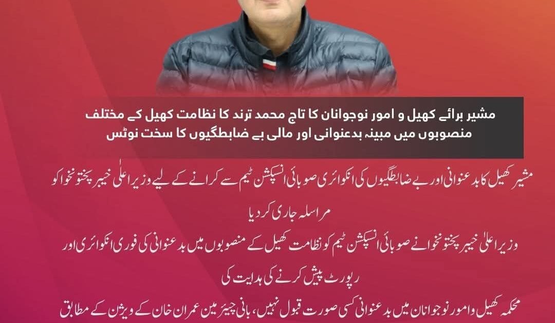 مشیرِ کھیل و امورِ نوجوانان تاج محمد ترند نے محکمہ کھیل کے مختلف منصوبوں میں مبینہ بدعنوانی اور مالی بے ضابطگیوں کا سخت نوٹس لیتے ہوئے معاملے کی مکمل انکوائری کے لیے وزیراعلیٰ خیبرپختونخوا کو مراسلہ بھیج دیا۔
