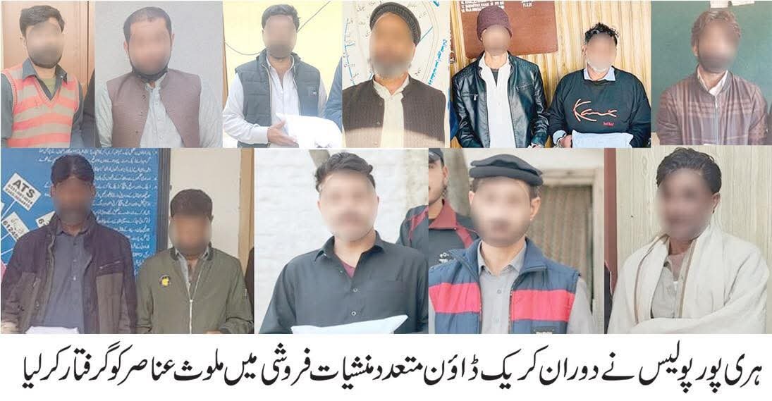 منشیات فروشوں کے خلاف بڑے پیمانے پر ہری پور پولیس کا کریک ڈاؤن جاری ۔متعدد منشیات فروشی میں ملوث ناسور گرفتار۔ مجموعی طور پر 2 روز کے کریک ڈاؤن میں 44کلو 035گرام چرس،410 گرام ہیروئن اور 437گرام آئس برآمد۔نارکوٹکس ایکٹ کے تحت مقدمات درج۔