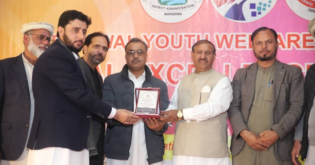 مانسہرہ: قاضی مدثر تنولی معروف سماجی شخصیت، و کوآرڈینیٹر وسیم ریاض فاؤنڈیشن تناول ایکسیلینس ایوارڈ میں اپنی شیلڈ وصول کی۔