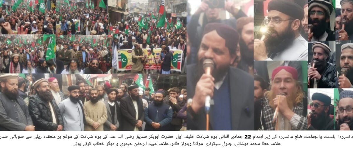 تفصیلات کے مطابق اہل سنت والجماعت ضلع مانسہرہ کے زیر انتظام 22 جمادی الثانی یوم شہادت خلیفہ اول حضرت ابوبکر صدیق رضی اللہ عنہ کے موقع پر عباسی چوک چنار روڈ سے مرکزی تحفظ ختم نبوت چوک تک پارٹی پرچموں سے مزین ریلی نکالی گئی.