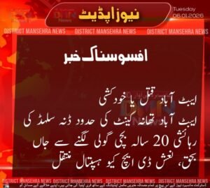 ایبٹ آباد میں پیش آنے والا واقعہ: قتل یا خودکشی؟ فیس بک ٹویٹر واٹس ایپ ای میل 38 0 تبصرے Yusra Shafqat جنوری 6, 2026January 6, 2026 اس خبر پر اپنی رائے کا اظہار کریں سخت نا پسند 0 Votes بہتر ہو سکتی تھی 0 Votes ٹھیک ہے 0 Votes اچھی ہے 0 Votes بہت اچھی ہے 0 Votes مزید پڑھیں ایبٹ آباد ٹریفک پولیس کی سیاحوں کے لیے خصوصی سہولیات اور رہنمائی—گلیات میں فیلڈ… کنزرویٹر وائلڈ لائف، ہزارہ سرکل کے دفتر کا دورہ ایڈیشنل ڈپٹی کمشنر مانسہرہ کی زیرِ صدارت قومی پولیو مہم فروری 2026 کی تیاریوں… خیبر پختونخوا پولیس میں بھرتی کانسٹیبل (BPS-07) دیر بالا پولیس کی اہم اور کامیاب کارروائی، واڑی کارودرہ سے فروخت ہونے والی… ضلعی پولیس سربراہ نے ڈپٹی کمشنر کے ہمراہ ڈی ایچ کیو ہسپتال بٹگرام کا… اپنا تبصرہ بھیجیں Cancel replyآپکا ای میل ایڈریس شائع نہیں کیا جائے گااپنا تبصرہ لکھیںآپکا نام* آپکا ای میل ایڈریس* آئیندہ تبصرہ کرنے کے لیے میرا نام اور ای-میل ایڈریس وغیرہ محفوظ کر لیں۔