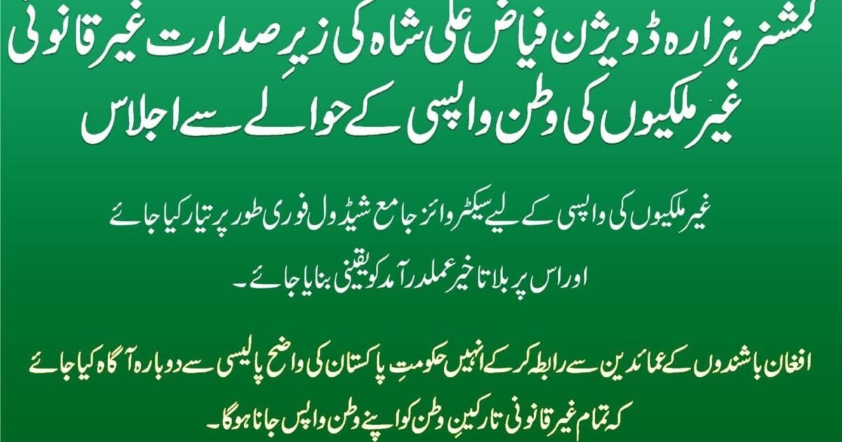 ایبٹ آباد: کمشنر ہزارہ فیاض علی شاہ و ڈی آئی جی ھزارہ ناصر ستیی زیرِ صدارت غیر قانونی غیر ملکیوں کی وطن واپسی پر اجلاس ہوا۔ سیکٹر وائز شیڈول، باعزت واپسی، عدم تعاون پر فارن ایکٹ کے تحت کارروائی اور سہولت فراہم کرنے والوں کے خلاف سخت ایکشن کی ہدایات۔ واپسی مہم ایک ماہ میں مکمل کرنے پر زور۔