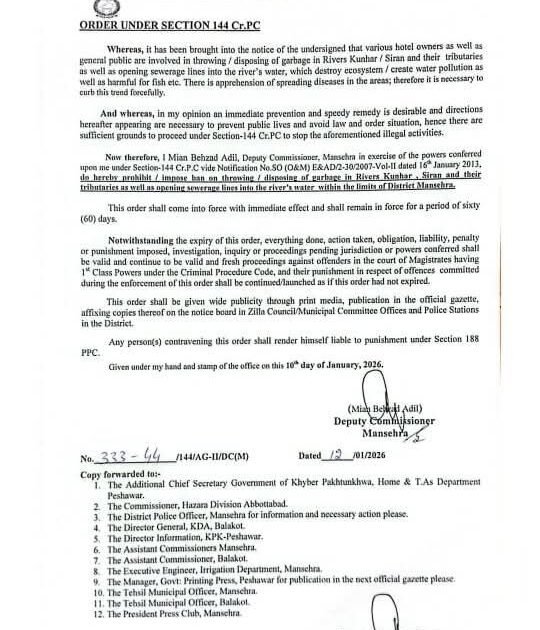 ڈپٹی کمشنر مانسہرہ نے دفعہ 144 کے تحت ضلع مانسہرہ کی حدود میں دریاؤں اور ان کی معاون ندی نالوں میں پلاسٹک بیگز اور دیگر کچرا پھینکنے پر مکمل پابندی عائد کر دی ہے۔