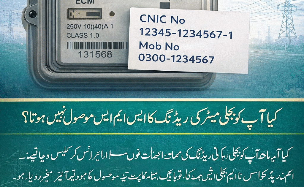 اگر آپ اپنا موبائل نمبر یا شناختی کارڈ (CNIC) نمبر بجلی کے میٹر کے ساتھ رجسٹر نہیں کروا سکے، یا رجسٹریشن کے باوجود آپ کو میٹر ریڈنگ کا ایس ایم ایس موصول نہیں ہو رہا، تو اس کی ایک بڑی وجہ میٹر پر مطلوبہ معلومات کی عدم موجودگی یا غلط اندراج ہو سکتی ہے۔