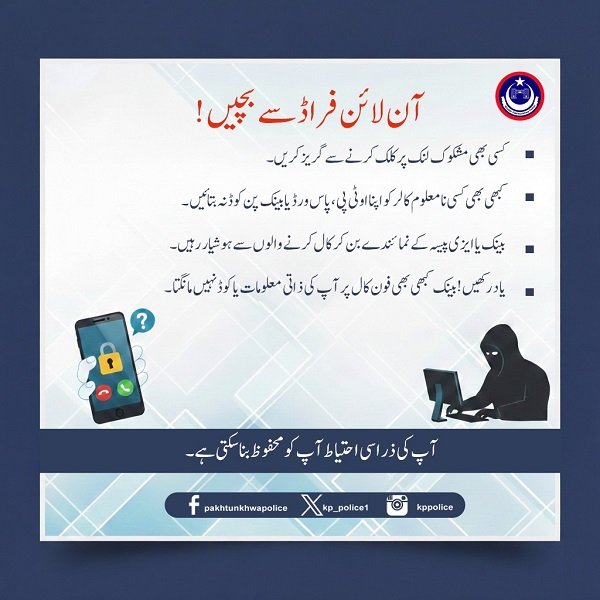 ▪ کبھی بھی کسی نامعلوم کالر کو اپنی او ٹی پی، پاس ورڈ یا بینک پن کوڈ نہ بتائیں۔
