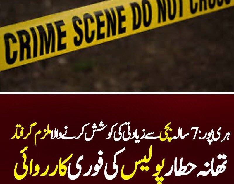 ہری پور کے علاقے حطار میں سات سالہ بچی کے ساتھ جنسی زیادتی کی کوشش کرنے والے ملزم کو پولیس نے چند گھنٹوں کے اندر گرفتار کر لیا ہے۔
