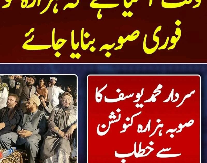 وفاقی وزیر مذہبی امور اور چیئرمین صوبہ ہزارہ تحریک سردار محمد یوسف نے کہا ہے کہ ہزارہ کو علیحدہ صوبہ بنانا اب محض سیاسی نعرہ نہیں بلکہ وقت کی ناگزیر ضرورت بن چکا ہے۔ انہوں نے یہ بات کراچی کے علاقے داؤد چورنگی میں ’صوبہ ہزارہ تحریک‘ کے زیر اہتمام منعقدہ ایک بڑے کنونشن سے خطاب کرتے ہوئے کہی، جس میں ہزارہ سے تعلق رکھنے والے افراد کی بڑی تعداد نے شرکت کی۔