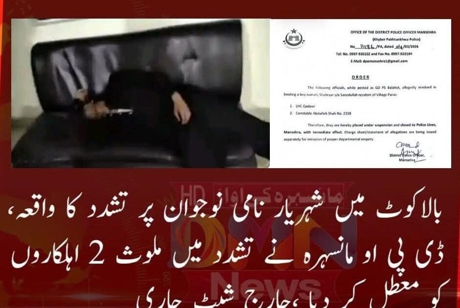 بالاکوٹ میں پارس کے رہائشی نوجوان شہریار پر مبینہ تشدد کی ویڈیو سوشل میڈیا پر وائرل ہونے کے بعد Mansehra Police کے ضلعی سربراہ محمد اظہر خان نے واقعے کا سختی سے نوٹس لیتے ہوئے فوری محکمانہ کارروائی کا حکم جاری کر دیا۔