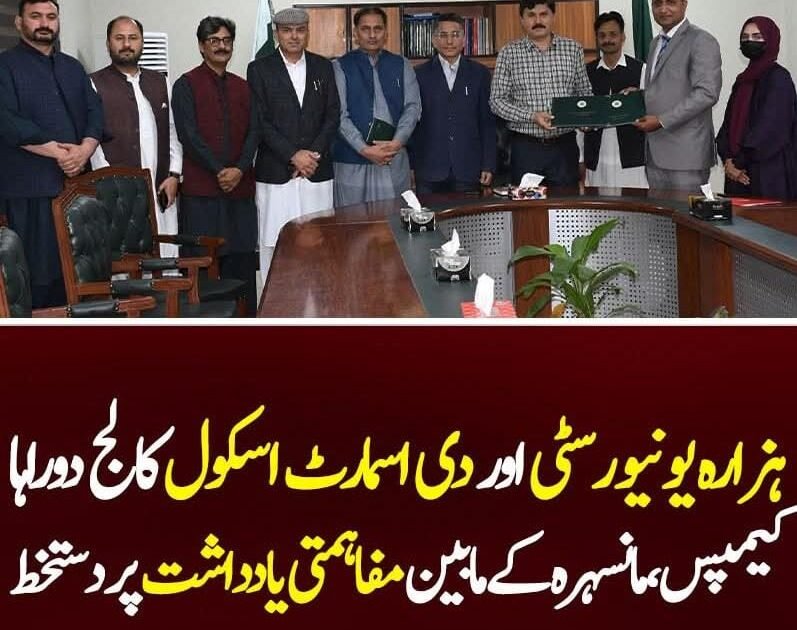 مانسہرہ میں تعلیم کے فروغ اور ادارہ جاتی تعاون کو مضبوط بنانے کے لیے ہزارہ یونیورسٹی مانسہرہ اور دی اسمارٹ اسکول کالج دوراہا کیمپس کے درمیان مفاہمتی یادداشت (MoU) پر باضابطہ دستخط کر دیے گئے۔ اس حوالے سے تقریب 9 مارچ 2026 کو ہزارہ یونیورسٹی کے وائس چانسلر سیکرٹریٹ میں منعقد ہوئی جس میں دونوں اداروں کے اعلیٰ حکام اور تعلیمی شخصیات نے شرکت کی۔
