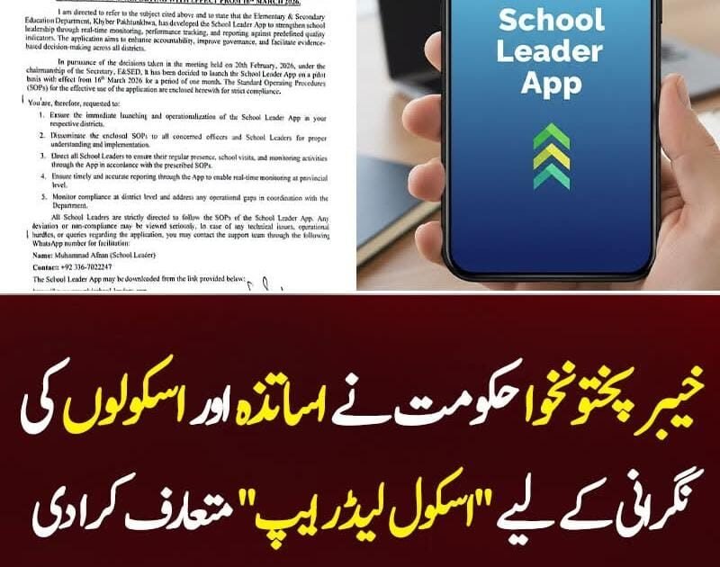پشاور: خیبر پختونخوا حکومت نے سرکاری تعلیمی اداروں میں نگرانی کے نظام کو جدید اور مؤثر بنانے کے لیے “اسکول لیڈر ایپ” (School Leader App) متعارف کرا دی ہے۔ محکمہ تعلیم کے مطابق یہ ایپ 16 مارچ 2026 سے صوبے کے مختلف اضلاع میں ایک ماہ کے پائلٹ منصوبے کے طور پر شروع کی جا رہی ہے، جس کے بعد اس کے نتائج کا جائزہ لے کر اسے پورے صوبے میں باقاعدہ طور پر نافذ کیا جائے گا۔