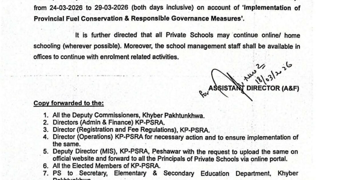 📍 ایبٹ آباد (مانسہرہ_ڈاٹ_کام) میں ضلعی انتظامیہ کی جانب سے ایک اہم نوٹیفکیشن جاری کیا گیا ہے، جس کے مطابق تمام پرائیویٹ تعلیمی اداروں کو 29 مارچ تک بند رکھنے کی ہدایت کی گئی ہے۔