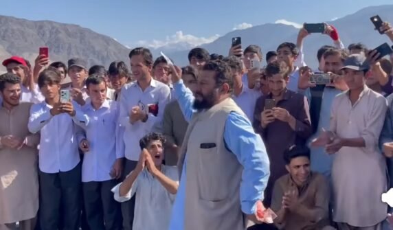 چلاس ڈگری کالج تانگیر کے پرنسپل جمعہ خان سپورٹس گالا میں اپنا روایتی رقص پیش کر رہے ہی